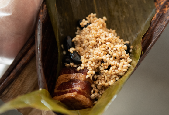 当店の粽(ちまき)には、丹波黒大豆を贅沢に使用しています。また、通常のセイロで蒸す粽(ちまき)とは違い、大鍋で煮込む台南式の伝統的な粽(ちまき)です。地元丹波篠山産の生のもち米を使い、モッチリとした食感、豚肉はとろける角煮に、黒豆はふっくら甘みを持ち、従来の粽(ちまき)とは異なった味わいになります。