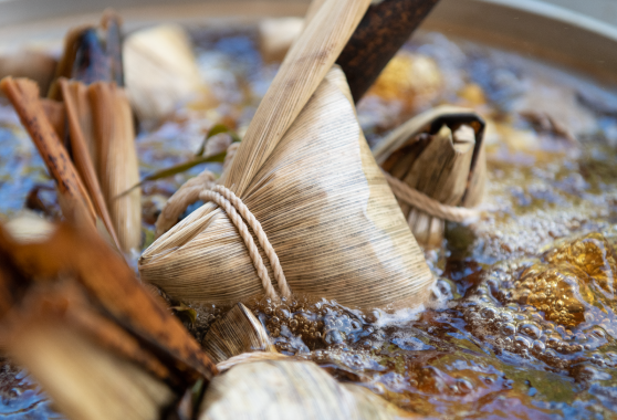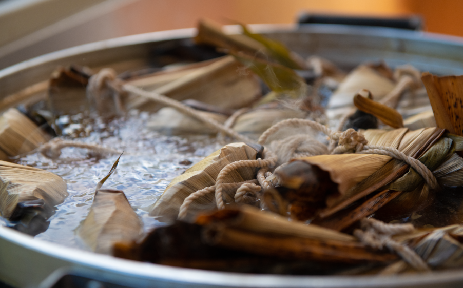 丹波篠山と言えば、黒大豆。当店の粽(ちまき)には、丹波黒大豆を贅沢に使用しています。また、通常のセイロで蒸す粽とは違い、大鍋で煮込む台南式の伝統的な粽(ちまき)です。