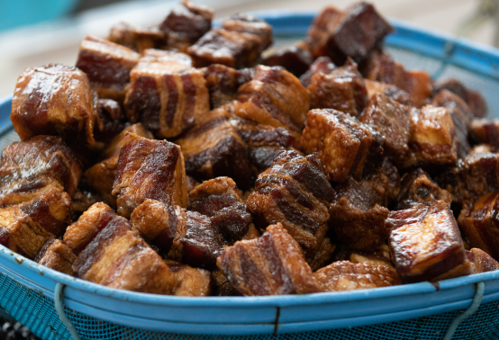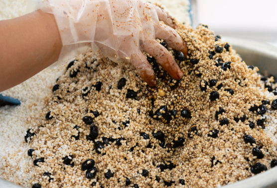 豚肉の油と相性の良い黒豆と豚肉をじっくりと煮込むことで、甘くおいしい仕上がりに、もち米はもっちりとした食感となります。
